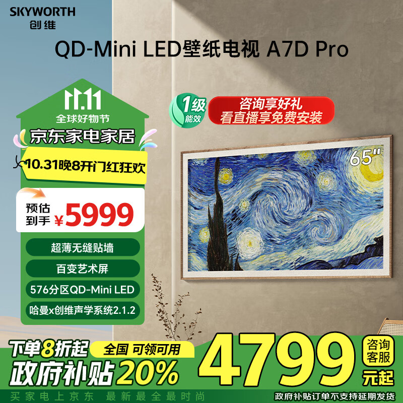 创维壁纸电视65A7D Pro 65英寸超薄壁画艺术电视机 无缝贴墙576分区Mini LED电视一级能效家电补贴价格:5999.00元!