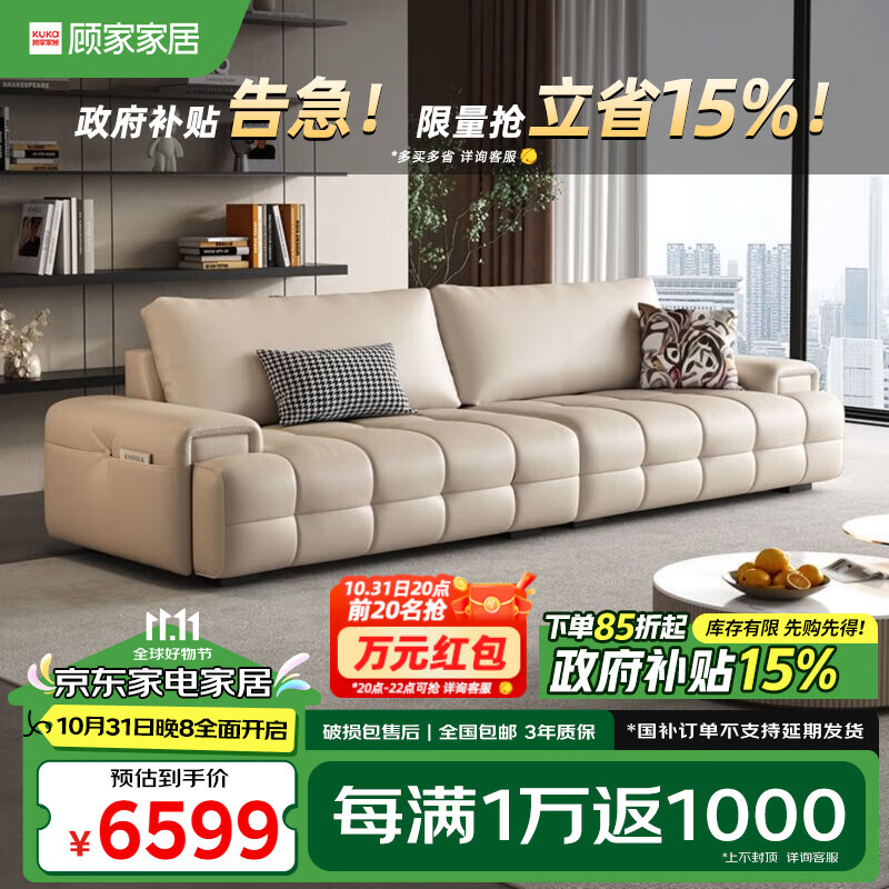 顾家家居(KUKA)劳伦斯沙发头层牛皮沙发客厅大户型别墅1219卡其色2.5M多人位价格:6599.00元!