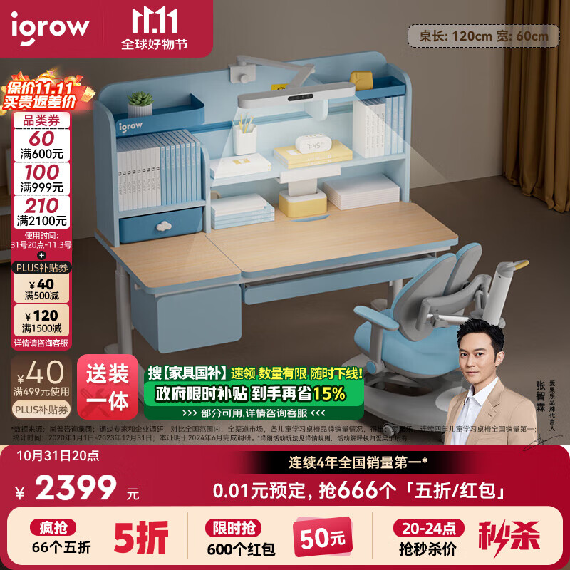爱果乐(IGROW)儿童学习桌书桌椅套装写字桌实木可升降桌中小学生家用课桌1.2m价格:2599.00元!