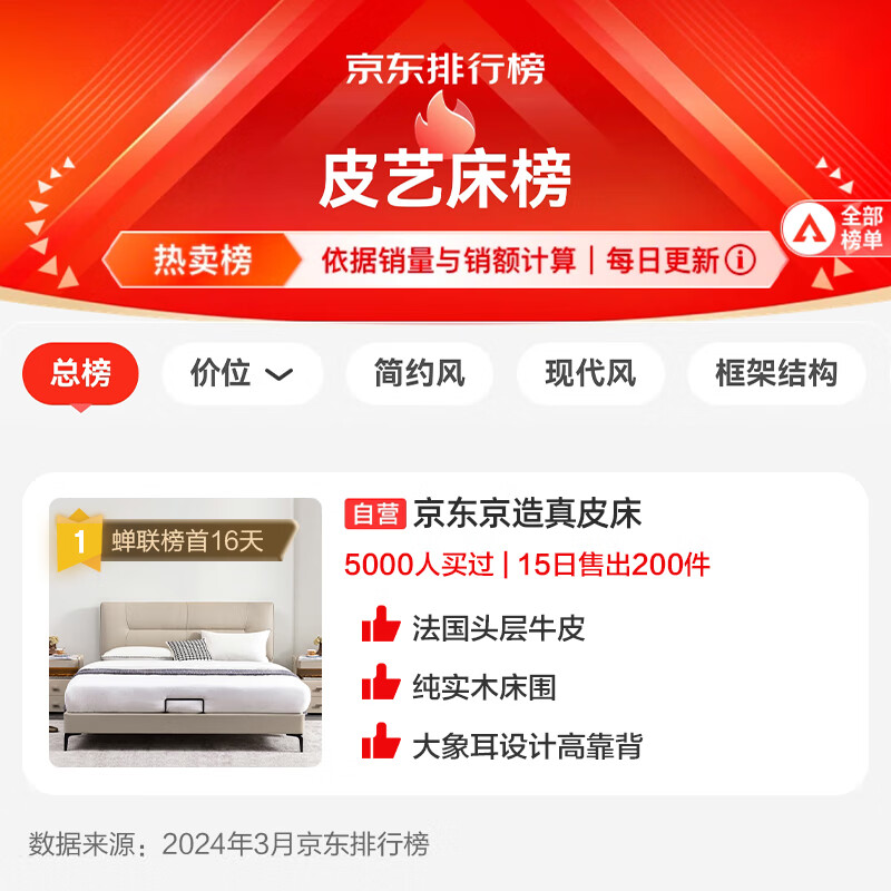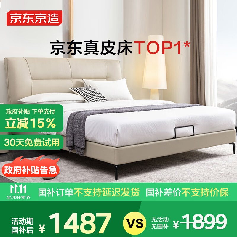 京东京造家居潮汐真皮床 头层牛皮实木框架 主卧双人床1.8×2米 补贴价格:1999.00元!