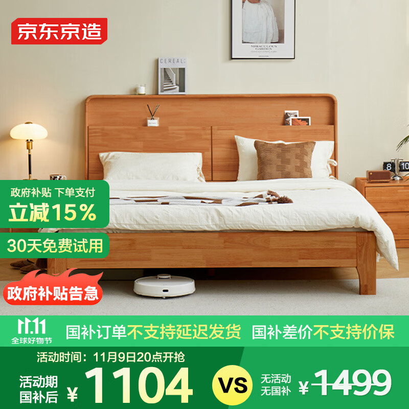 京东京造家居悦枫实木床 天然橡胶木 主卧双人床原木色1.8×2米 补贴价格:1599.00元!