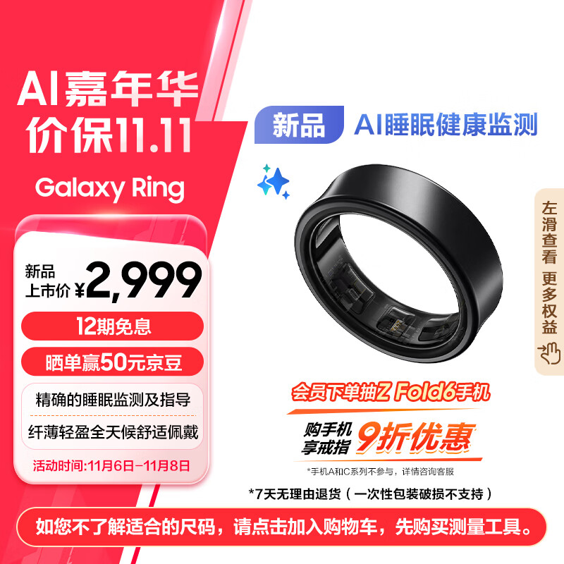 三星Samsung【手机老客享9折】 Ring 智能戒指/智能指环/的睡眠监测及指导/持久续航 11号 钛黑价格:2999.00元!