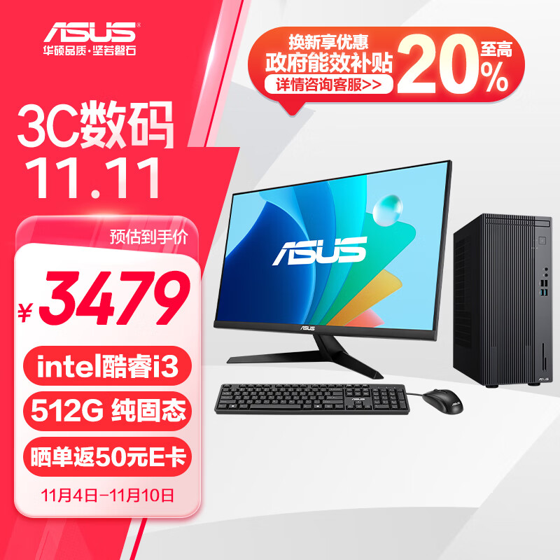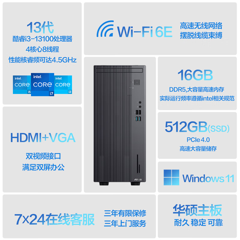华硕破晓X 个人办公家用商用台式机电脑整机(13代酷睿i3-13100 16G 512G SSD)27英寸显示器价格:3479.00元!