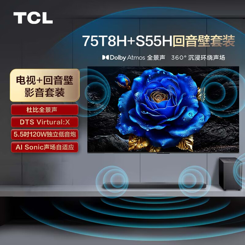 TCL音响版本-75T8H 75英寸 百级分区量子点电视 T8H+杜比全景声回音壁 S55H价格:4798.00元!
