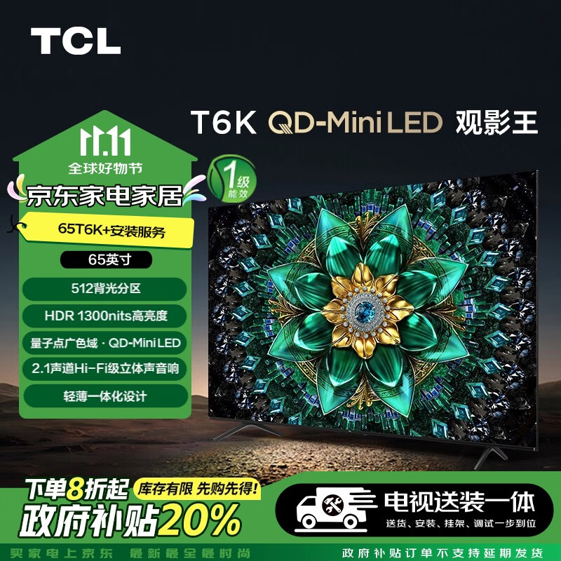 TCL【送装一体版】65T6K 65英寸 QD-Mini LED电视 T6K+安装服务含挂架价格:3638.00元!