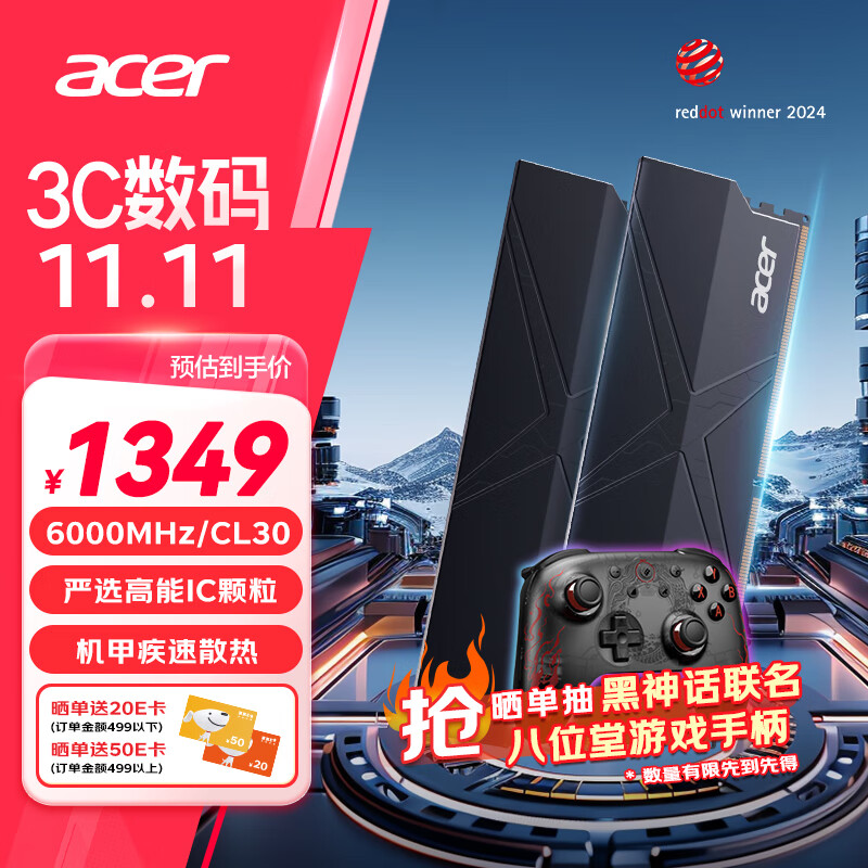 宏碁(acer) 64G(32G×2)套装 DDR5 6000频率 台式机内存条 HT200系列(C30) 炫光黑 AI电脑配件价格:1349.00元!