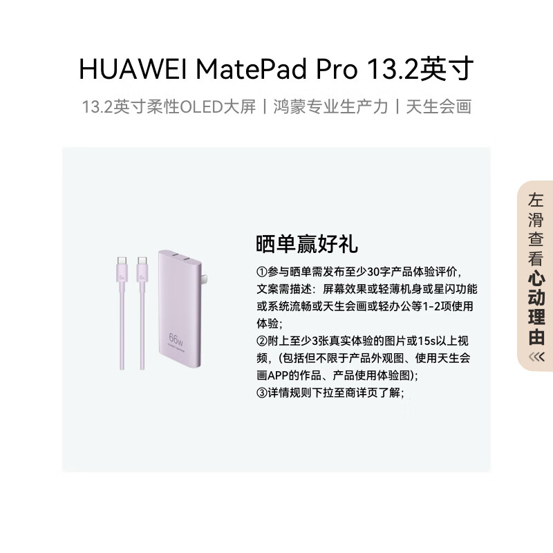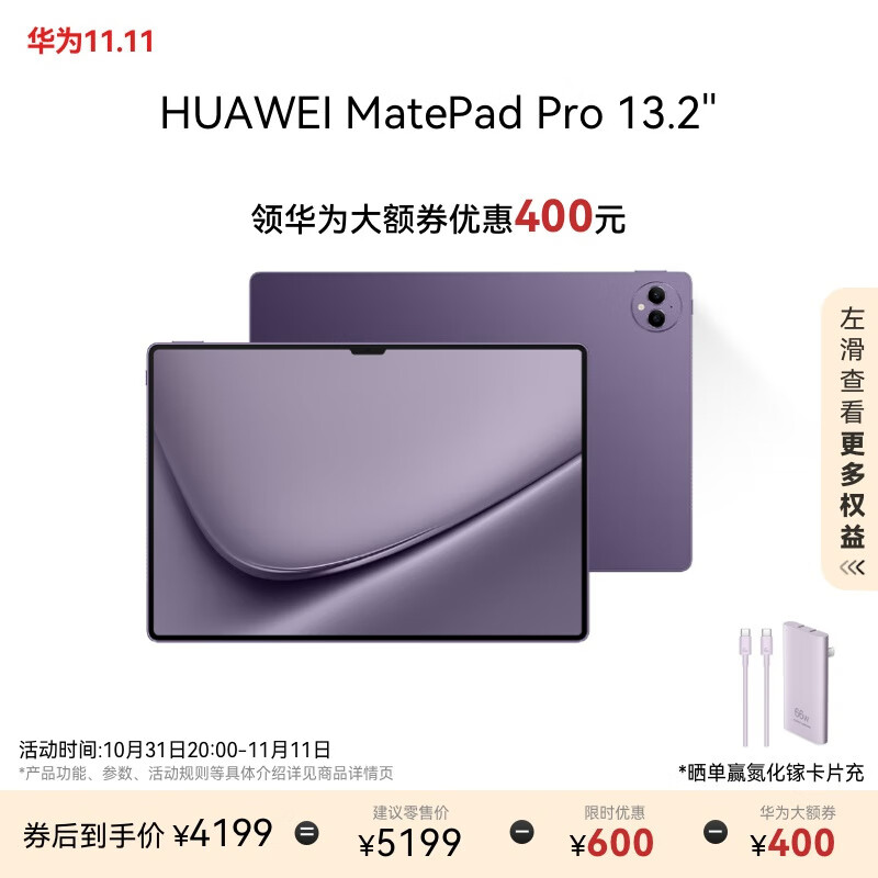 华为大额券丨HUAWEI MatePad Pro 13.2英寸华为平板电脑OLED护眼屏办公创作12+256GB WiFi 罗兰紫价格:4599.00元!
