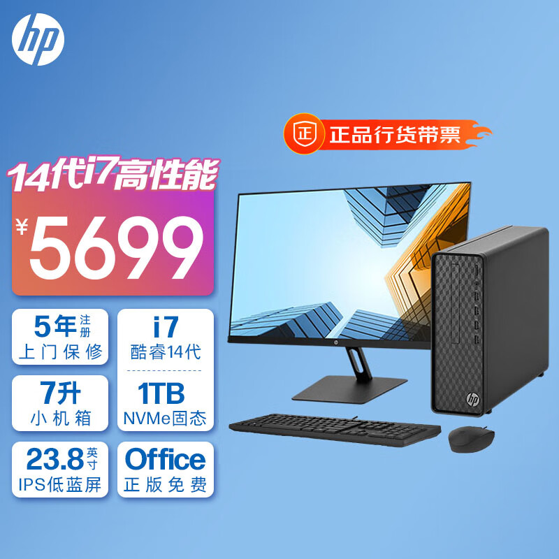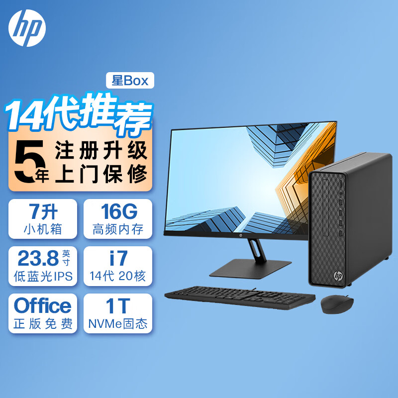 惠普HP 星Box高性能商务办公台式电脑主机 政府补贴(14代酷睿i7-14700 16G 1TBSSD WiFi)+23.8英寸价格:5699.00元!