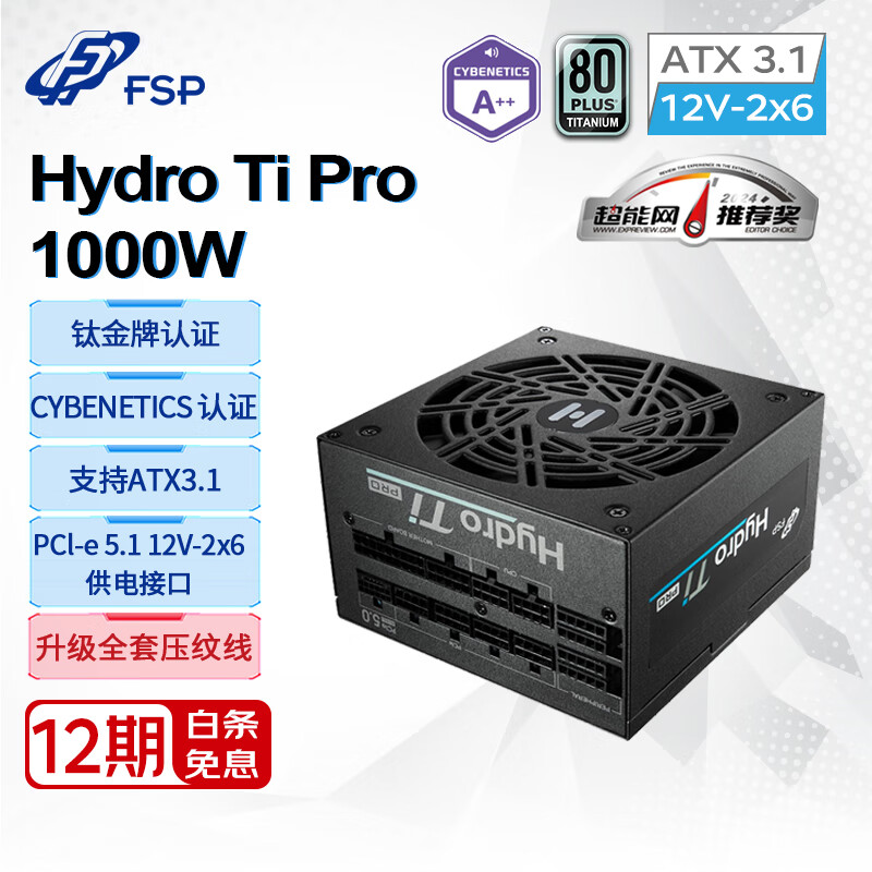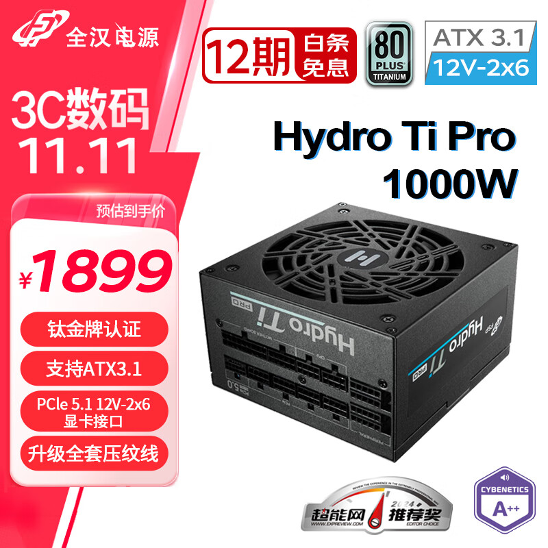 全汉(FSP)Hydro Ti Pro1000W双认证钛金牌全模组电源(全套压纹线/ATX3.1/PCle12V-2x6/ 噪音等级A++认证)价格:1899.00元!