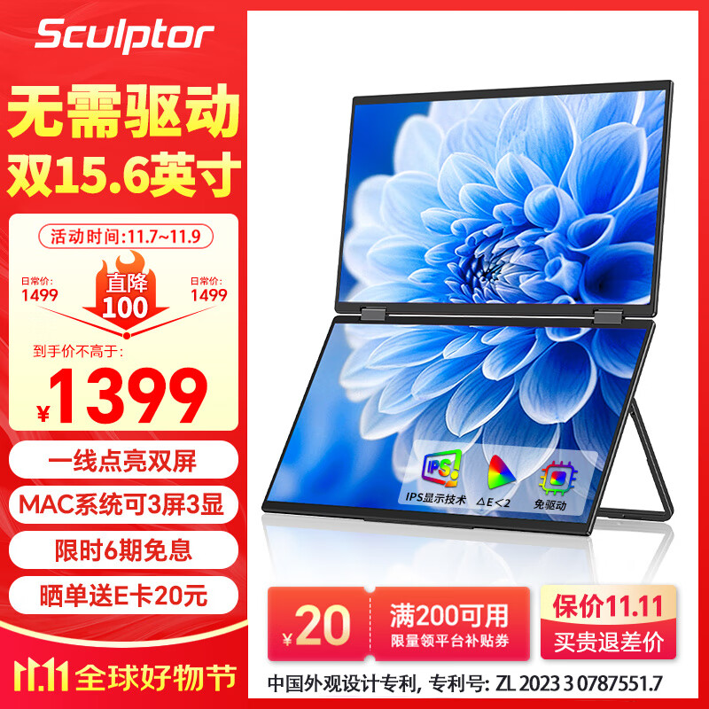 雕塑家 15.6英寸双屏便携式显示器可折叠 扩展三屏笔记本电脑副屏 外接办公炒股游戏电脑扩展屏幕大屏价格:1499.00元!