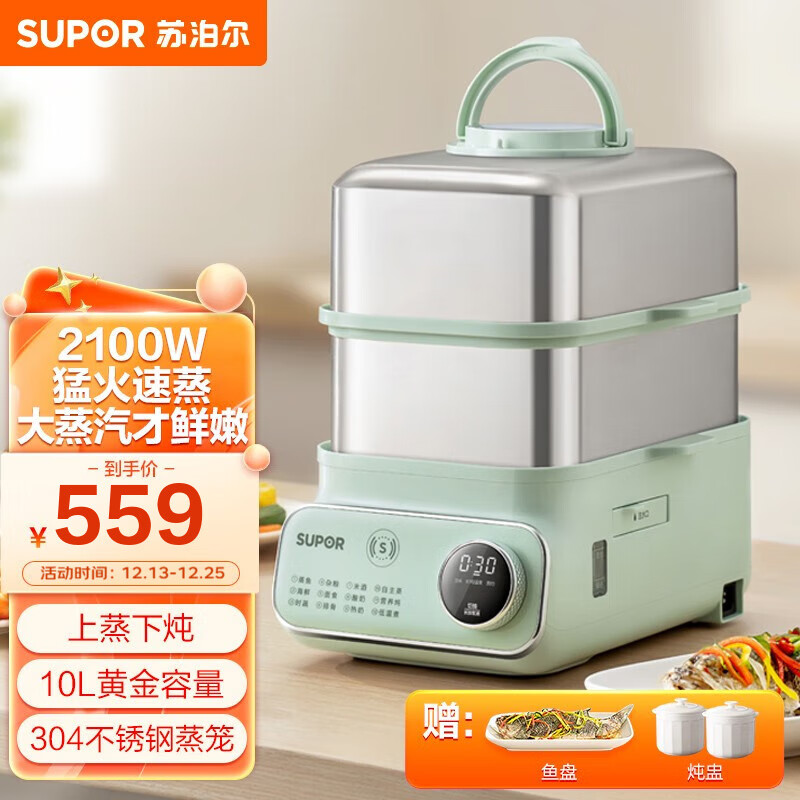 苏泊尔(SUPOR) 全钢电蒸锅2100W大功率猛火速蒸上蒸下炖多档调温304不锈钢蒸笼智能预约料理锅ZN2030FC833价格:599.00元!