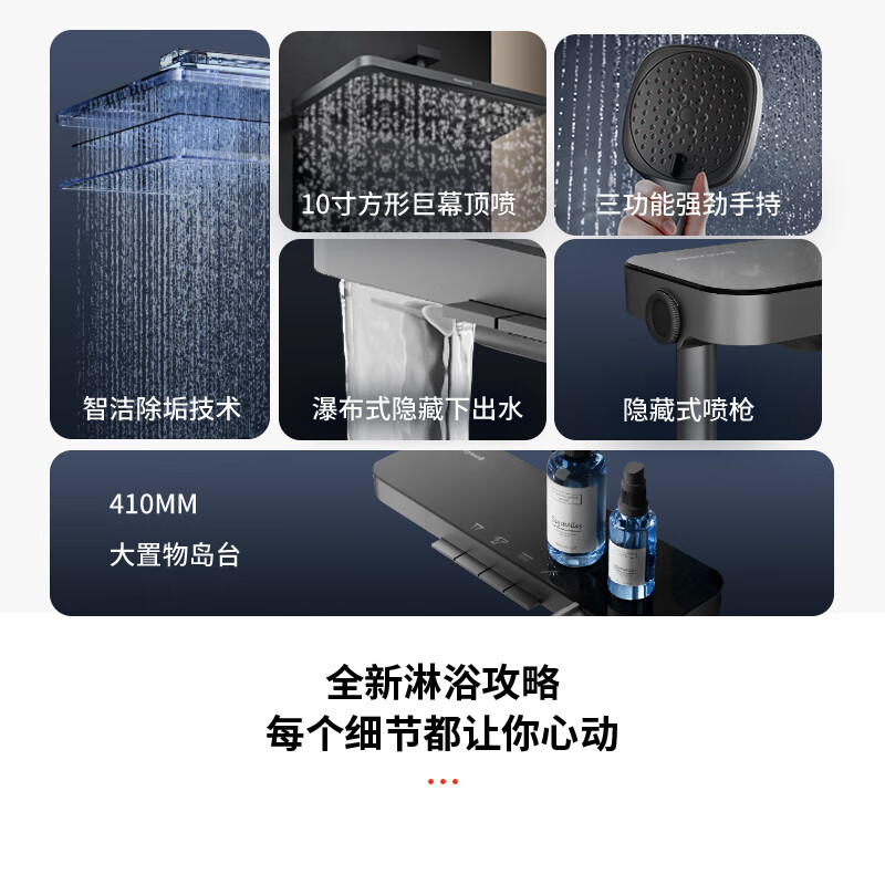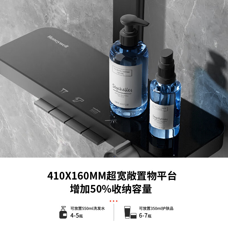 2、想要的功能都有了,出水量大,效果好,每种出水设计合理好用。整体风格大气,用料足。置物台够宽,可以放洗面奶,洗发水,沐浴露。好评。
