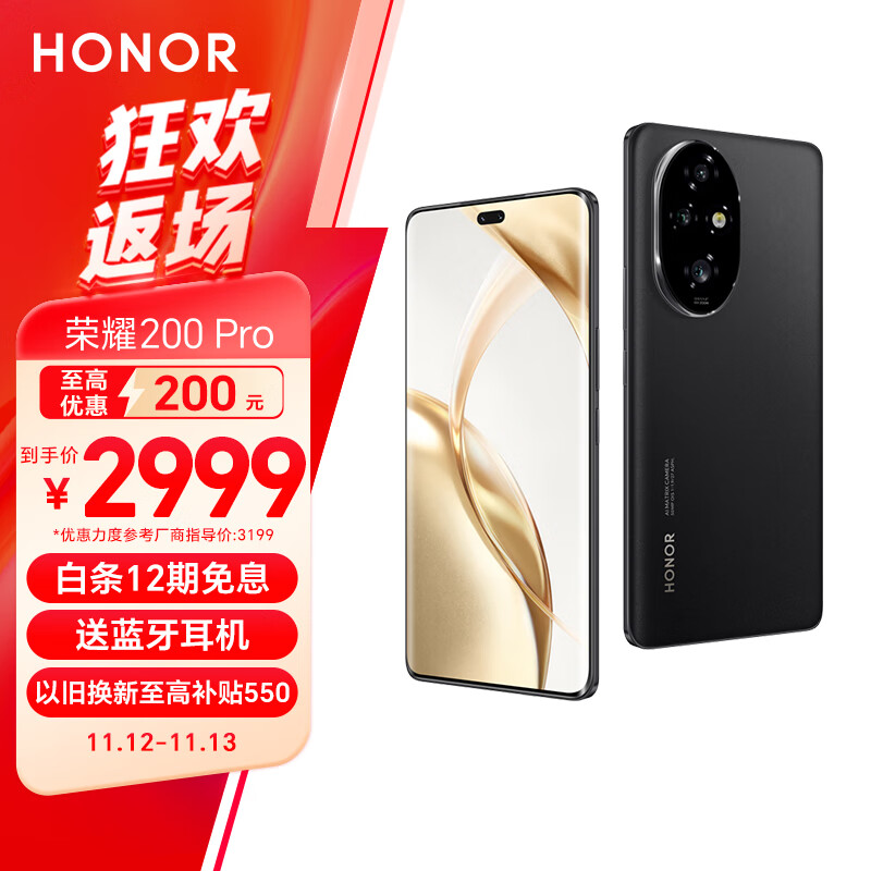 荣耀200 Pro 旗舰级青海湖电池 绿洲护眼屏 5000万雅顾光影主摄 12+256 绒黑色 拍照 AI 新款 5G手机价格:2999.00元!
