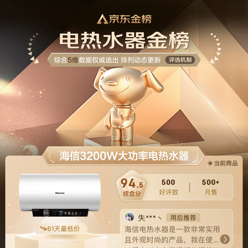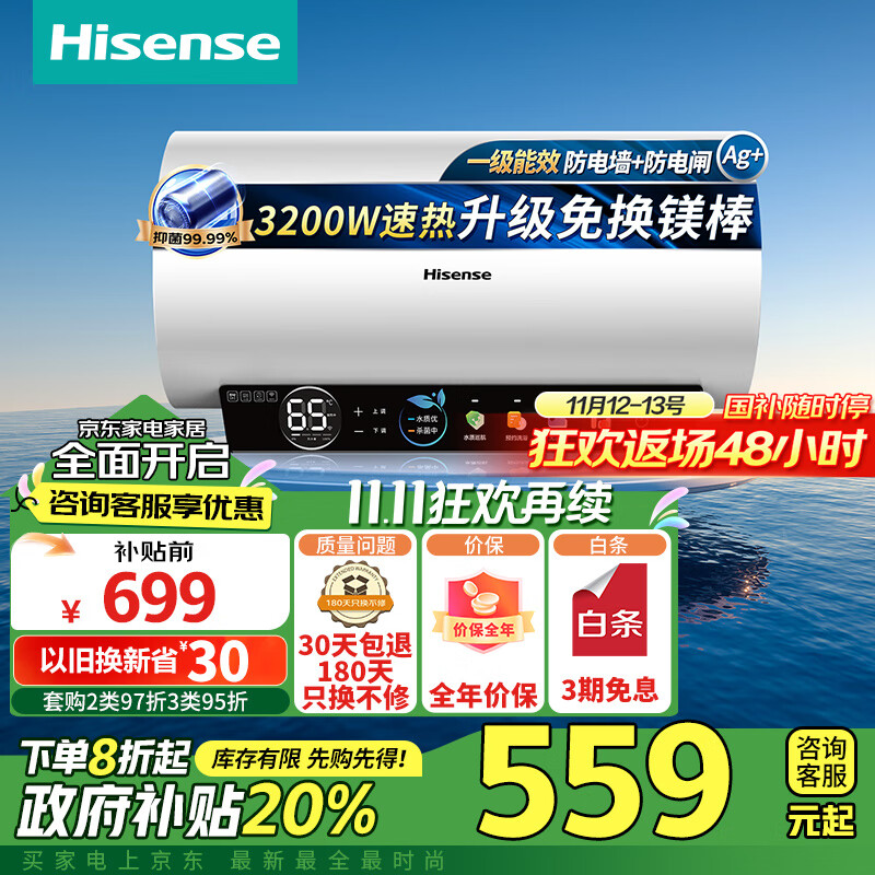 海信(Hisense)60升家用电热水器3200W大功率8倍增容钻石无缝胆升级免换镁棒一级能效双重防电ES60-C301i补贴价格:699.00元!
