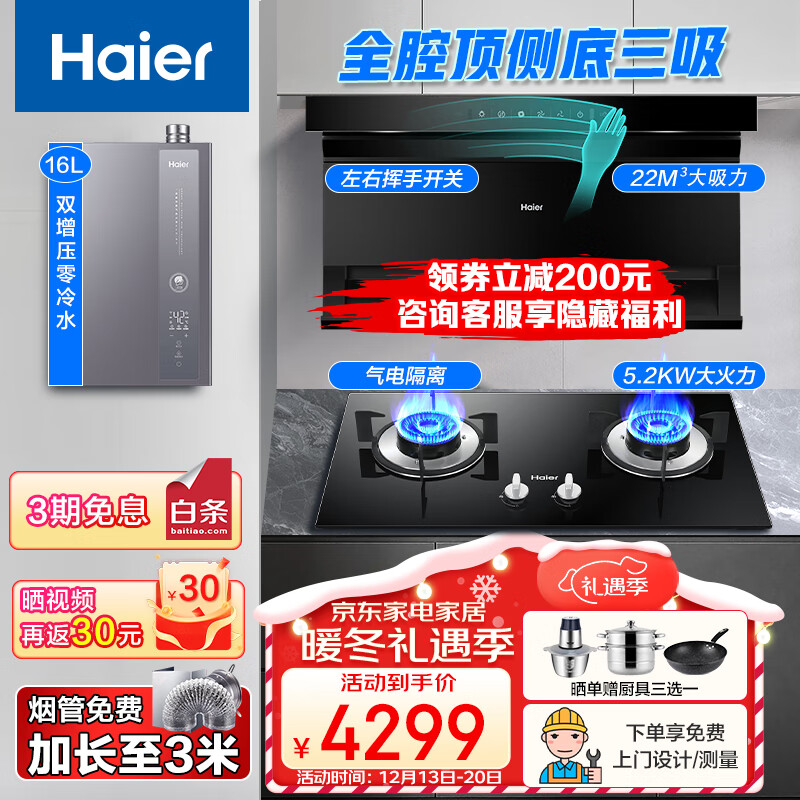 海尔(Haier)抽油烟机燃气灶套22m3挥手智控顶侧双吸EC710+5.2KW灶Q2BE50+16升零冷水热水器厨房三件套[家电]价格:4499.00元!