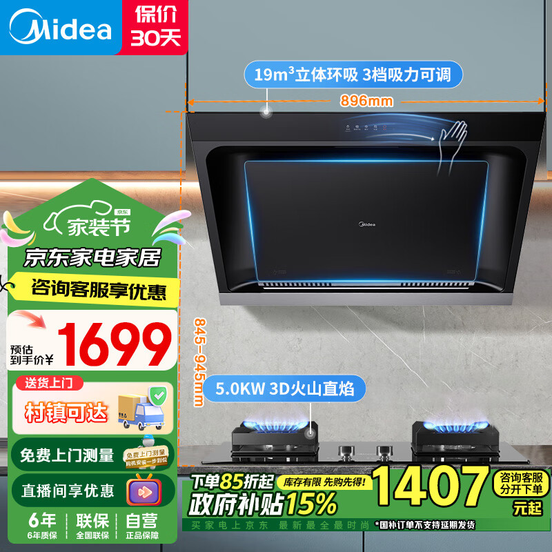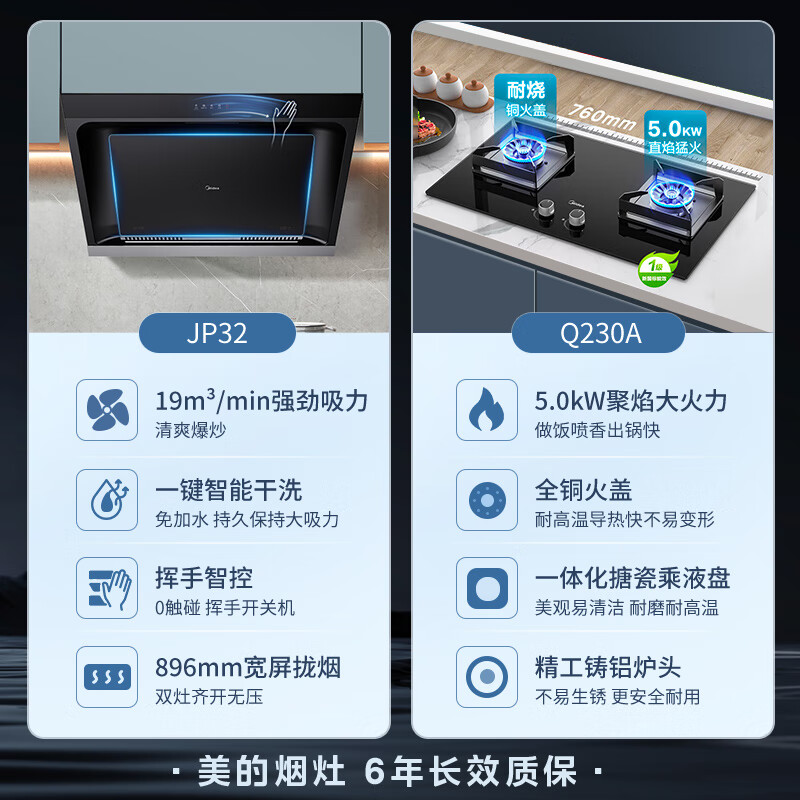 美的(Midea)抽烟机燃气灶套装 家用19风量侧吸自动清洗脱排烟机油烟机 5.0kW一级能效灶JP32+Q230A液化气价格:1669.00元!