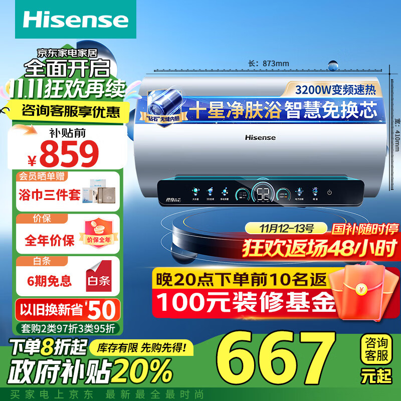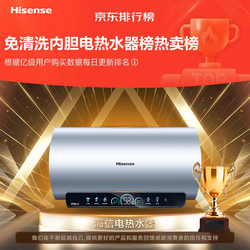 海信(Hisense)60升家用电热水器 3200W变频速热 一级能效 镁棒免更换 钻石无缝内胆 大屏C509i智享 补贴价格:959.00元!