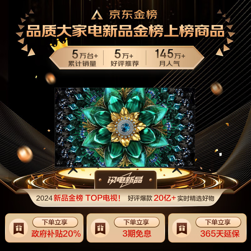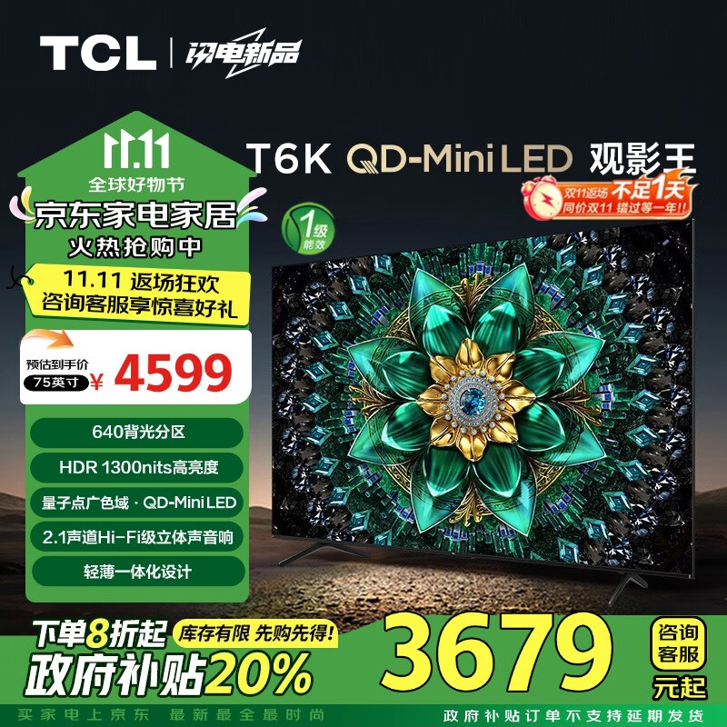 TCL电视 75T6K 75英寸 QD-Mini LED 640分区 QLED量子点 HDR 1300nits 超薄 电视 家电补贴 一级能效价格:4599.00元!