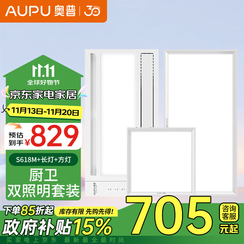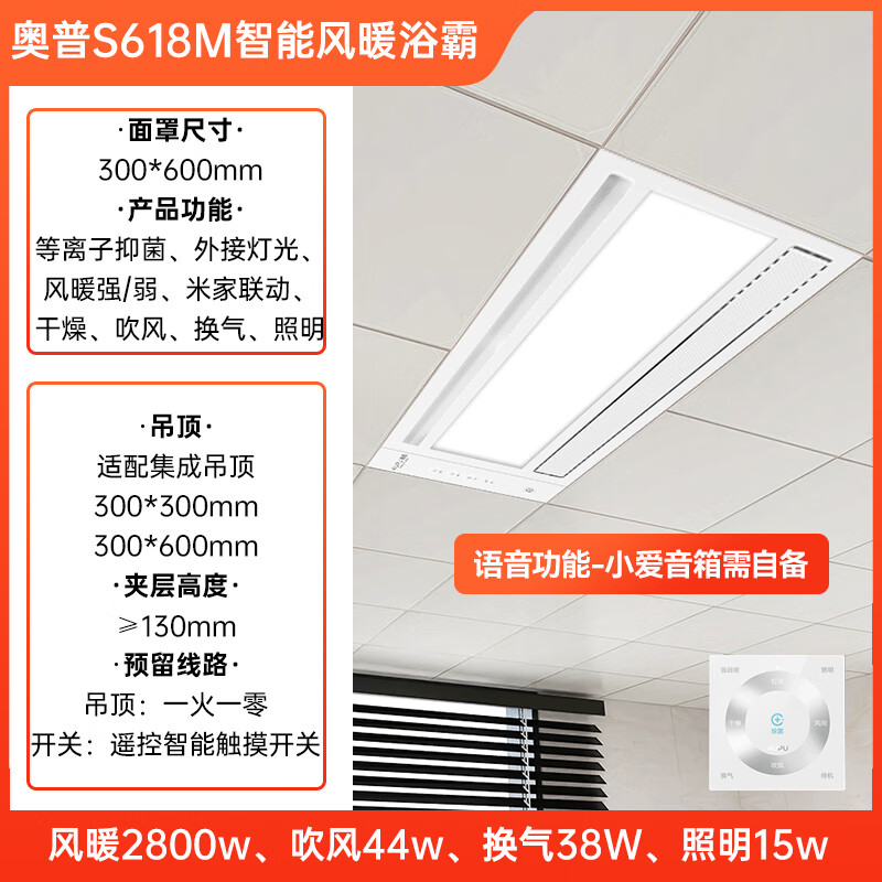 奥普(AUPU)浴霸S618M风暖抑菌浴霸无线遥控米家联动+[长灯+方灯](附件形式)价格:829.00元!