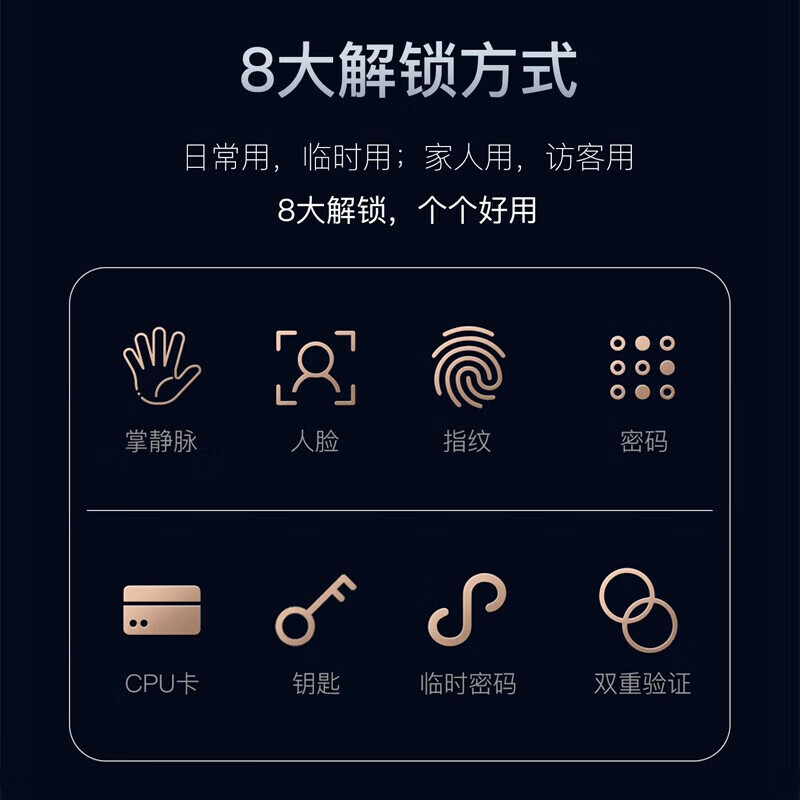 开锁方式:APP,临时密码,密码,人脸识别,手机小程序,刷卡,钥匙,半导体指纹