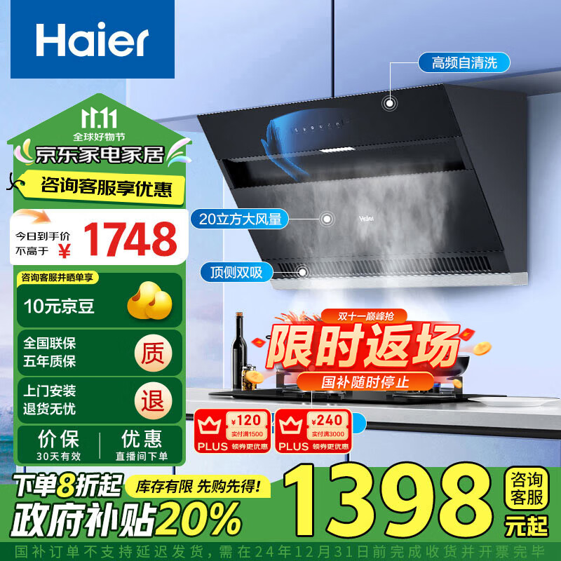 海尔(Haier)抽油烟机 顶侧双吸厨房烟灶套装 20m3/min大吸力 家用侧吸式油烟机灶具套装C6JS+Q2BE2液价格:1698.00元!