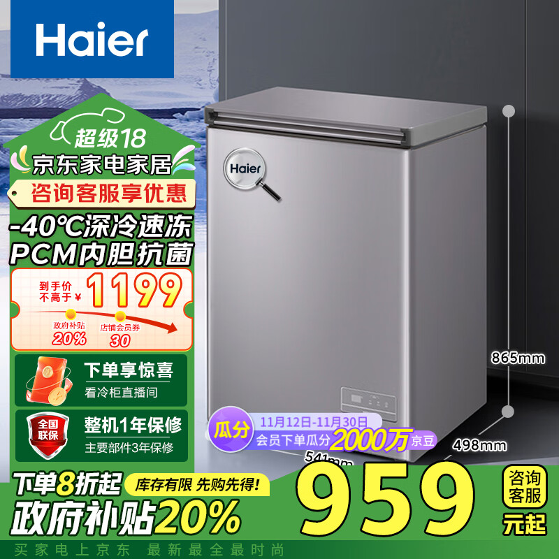 海尔(Haier)100升-40℃智控低霜小冰柜家用商用 冷藏柜冷冻柜冰柜小型小冰箱小型冷柜BC/BD-100GHEPC国补换新价格:1199.00元!