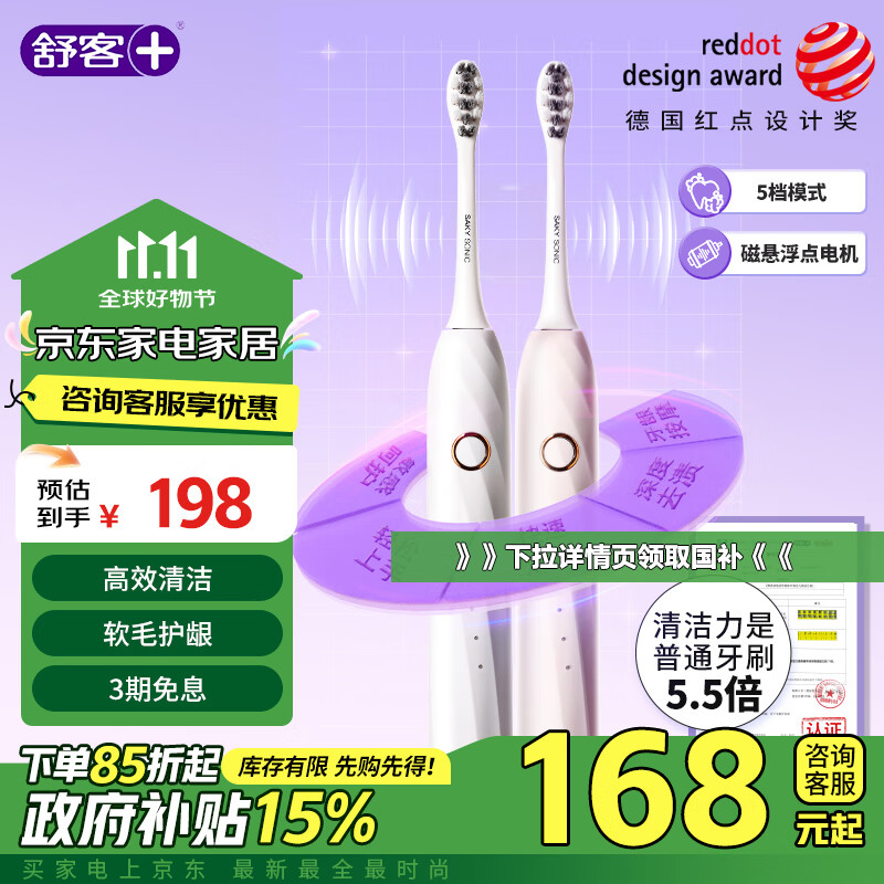 舒客情侣电动牙刷智能换区清洁成人/家电政府补贴男士/女友软毛护龈声波5档T2粉+T2白【2支装】价格:198.00元!