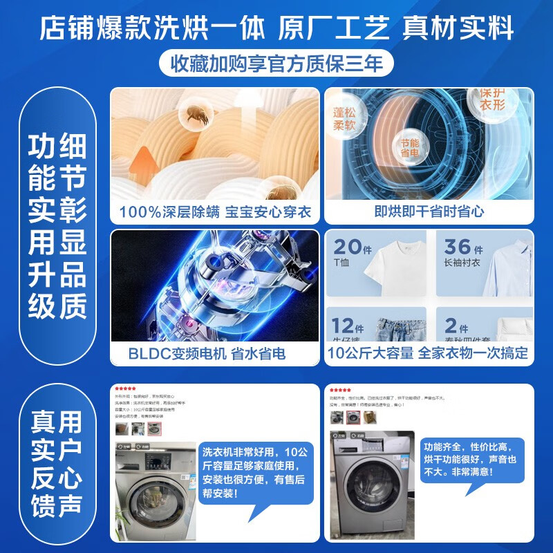 3、这款洗烘一体的洗衣机很让人惊喜,外形美观甩干有力,10公斤大容量满足家庭使用。上午到货下午就能安装。师傅态度非常好,推荐购买支持国货
