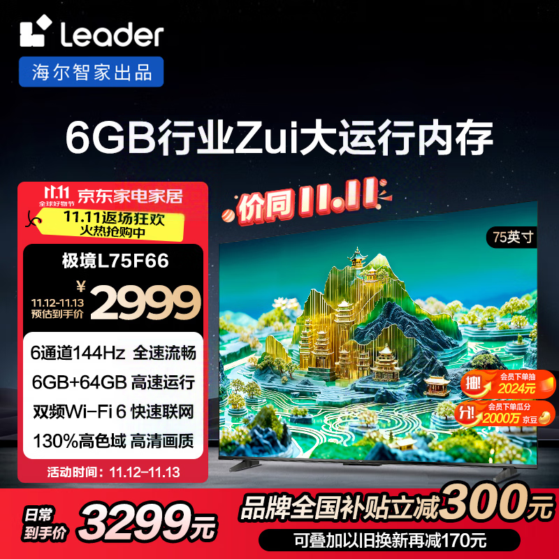统帅(Leader)海尔智家出品L75F66 75英寸4K超高清电视144Hz屏6+64GB护眼平板游戏液晶智慧屏价格:2999.00元!