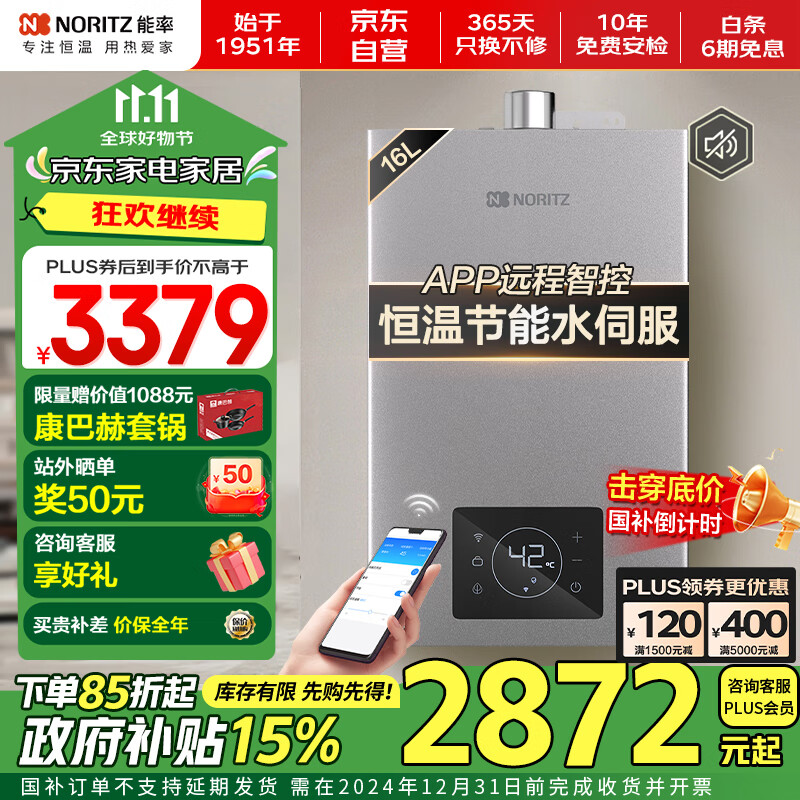 能率(NORITZ) 16升燃气热水器天然气【家电政府补贴15%】恒温速热 节能静音水伺服 下置风机GQ-16V36AFEX价格:3299.00元!