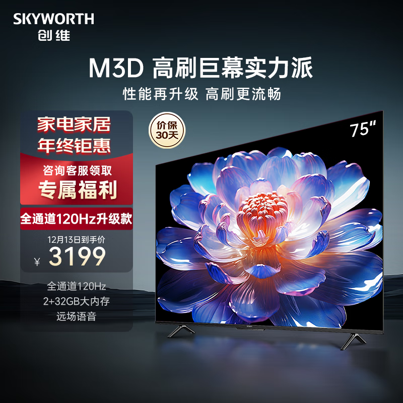 创维电视75M3D 75英寸120Hz高刷 2+32GB远场语音 4K高清智慧屏超薄液晶平板电视机 以旧换新75A3D价格:2999.00元!