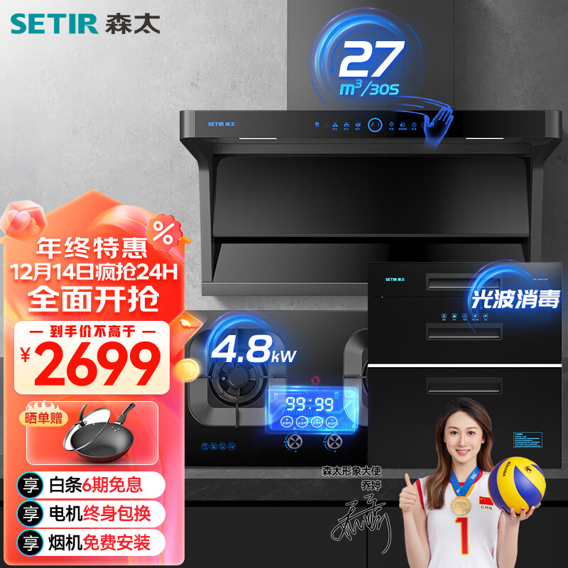 森太(SETIR)吸油烟机灶具套装 顶侧双吸抽油烟机鸳鸯定时燃气灶消毒柜厨房三件套 B833+TM81+F260(液化气)价格:2999.00元!