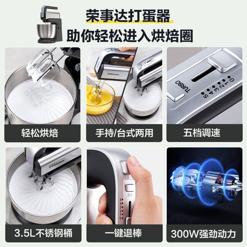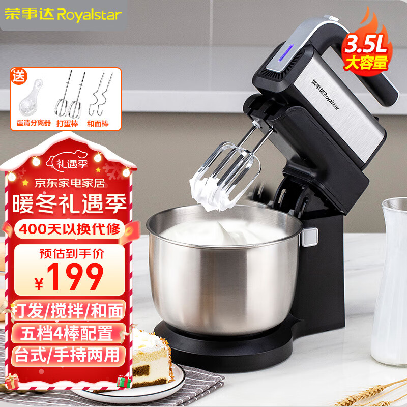 荣事达(Royalstar) 打蛋器台式电动打蛋机家用3.5L 手持搅拌机带桶烘焙奶油机蛋清打发器和面搅拌器EGK395L价格:199.00元!