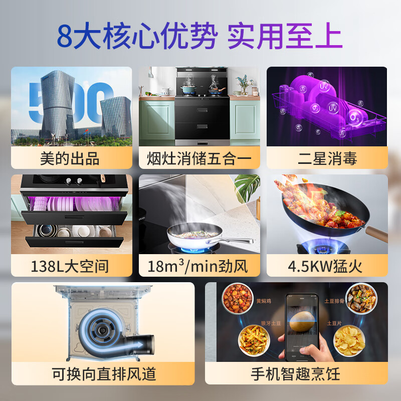 4、美的的产品一直不错,家里的空调冰箱都是美的的,所以集成灶也选的美的的,性价比很高,看着很不错,颜值也很高,吸力满大的,消毒和储物空间完全够用,省去了拉篮的钱,整体很满意,期待入住后效果。