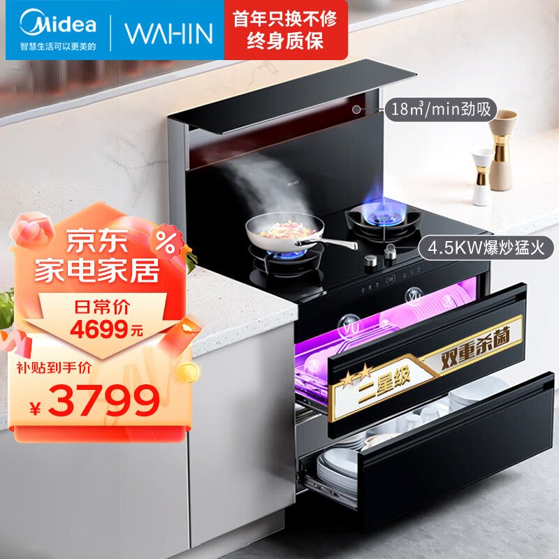华凌 美的出品集成灶 油烟机燃气灶 二星消毒柜 储物柜一体式 可换向风道 JJZY-90WD26-G 液化气价格:3916.00元!