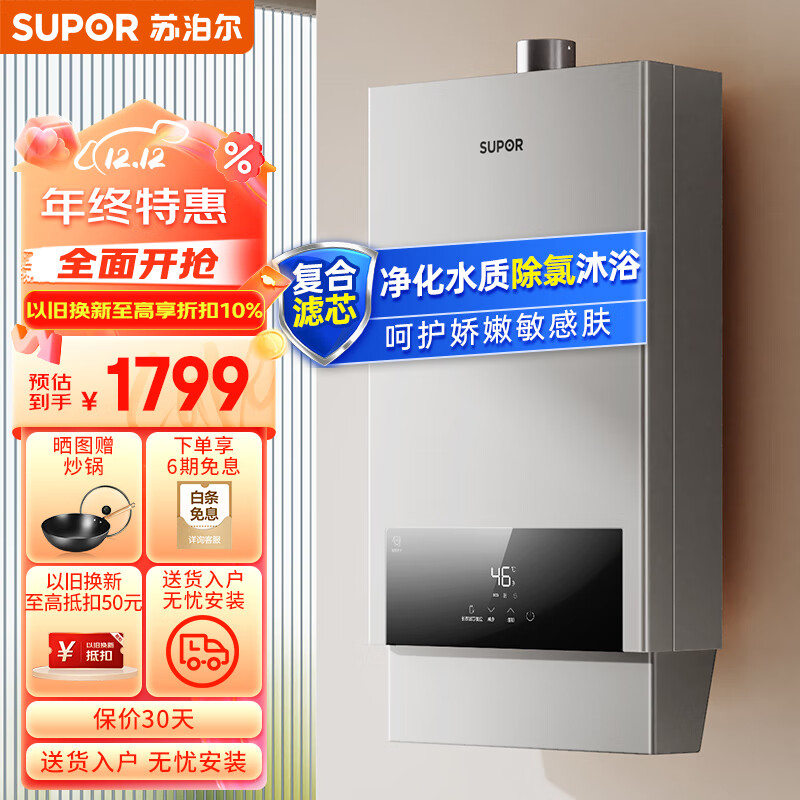 苏泊尔(SUPOR)16升燃气热水器智能精控恒温净肤除氯健康洗家用天然气强排式燃气热水器ECO节能16R-DK21S价格:1799.00元!