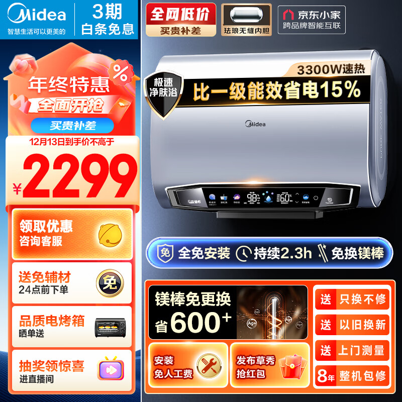 美的(Midea)电热水器60升扁桶 超薄双胆速热家用3200W变频 双免换镁棒 京东小家一级能效全免安装F6032-UD(HE)价格:2299.00元!