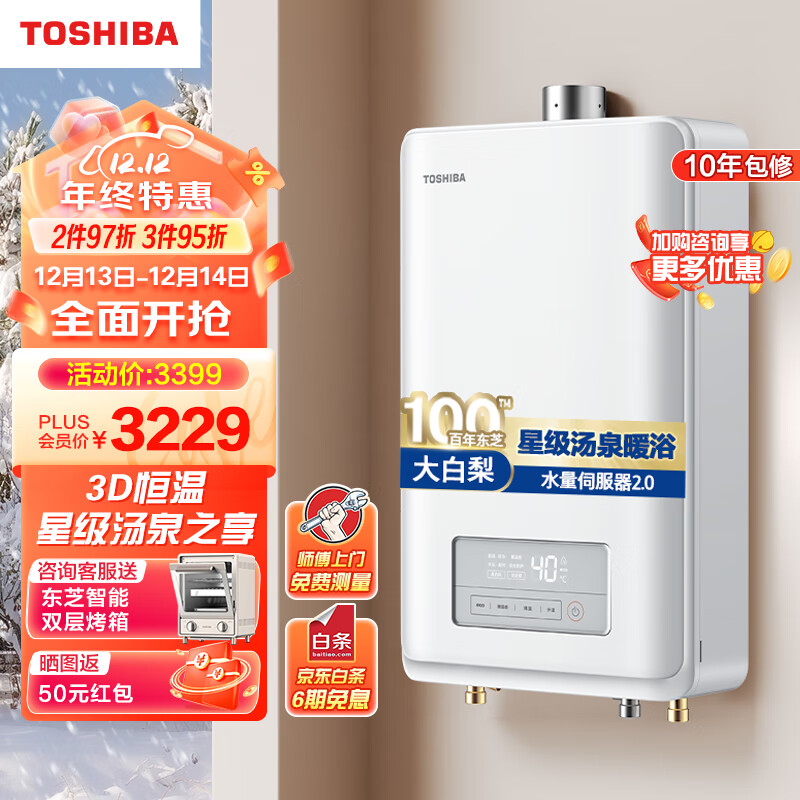 东芝(TOSHIBA)16升燃气热水器 天然气水伺服 3D恒温 进口CPU 下置风机 多重安防 大白梨TL8价格:3399.00元!