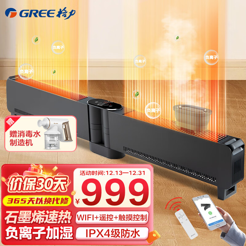 格力(GREE) 石墨烯折叠踢脚线取暖器家用远程遥控IPX4级防水电暖气片家用大面积速热移动地暖风机 1.5米石墨烯负离子款NDJD-S6022B价格:1049.00元!