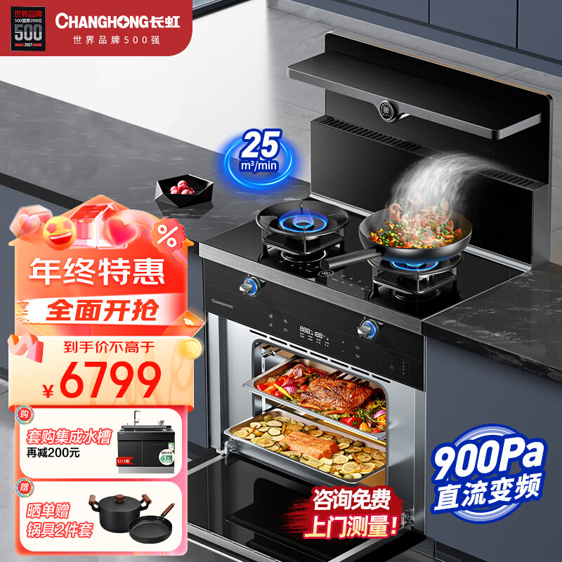 长虹(ChangHong)集成灶蒸烤炸一体灶 变频节能集成灶 蒸箱烤箱一体式 25m3/min大吸力家用抽油烟机套装AC1K天然气价格:6799.00元!