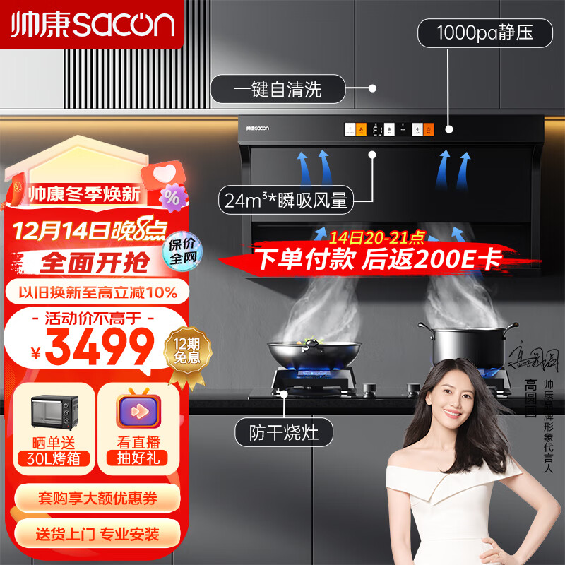 帅康(Sacon)油烟机 顶侧双吸变频静音抽油烟机24m3瞬吸风量7字机油烟机防干烧灶套餐 Y8275+E8T01F(液化气)价格:3499.00元!