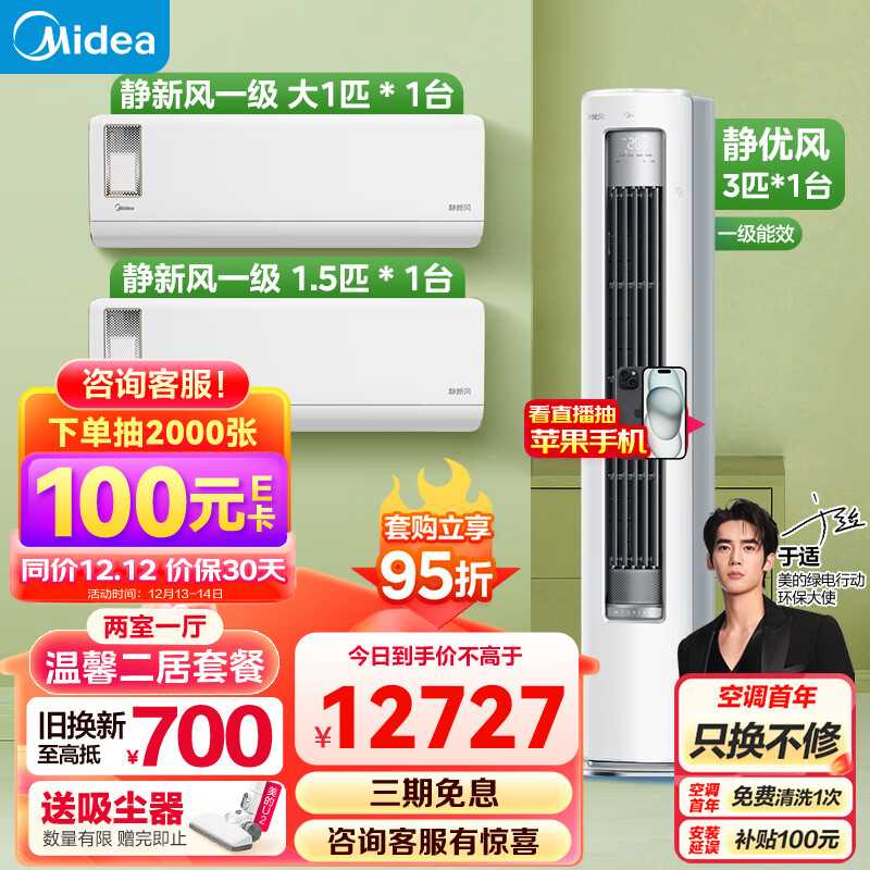 美的(Midea)新风空调温馨两居套餐(1.5匹静新风挂机*1+大1匹静新风挂机*1+3匹静优风柜机)一站购齐套购价格:13397.00元!