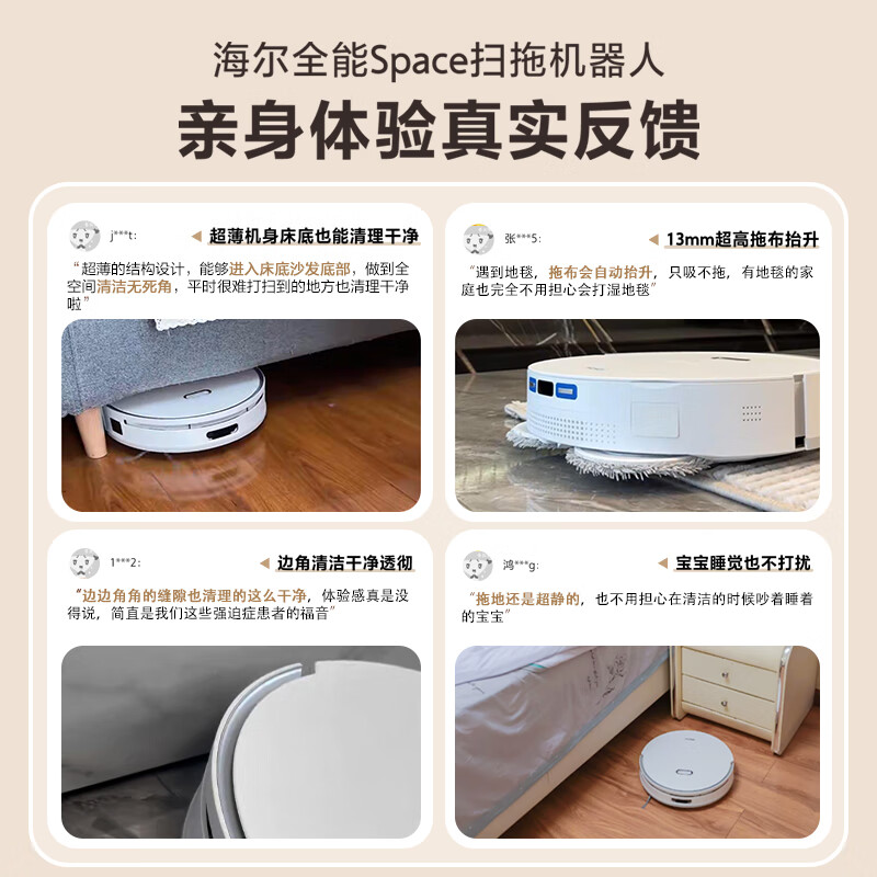 4、这拖扫一体机很棒,拖扫很干净,还能选择指定区域清洁,效果可以。性价比高,比其他牌子同类型的机器人便宜至少50%。海尔,国产品牌,中国骄傲!赞!