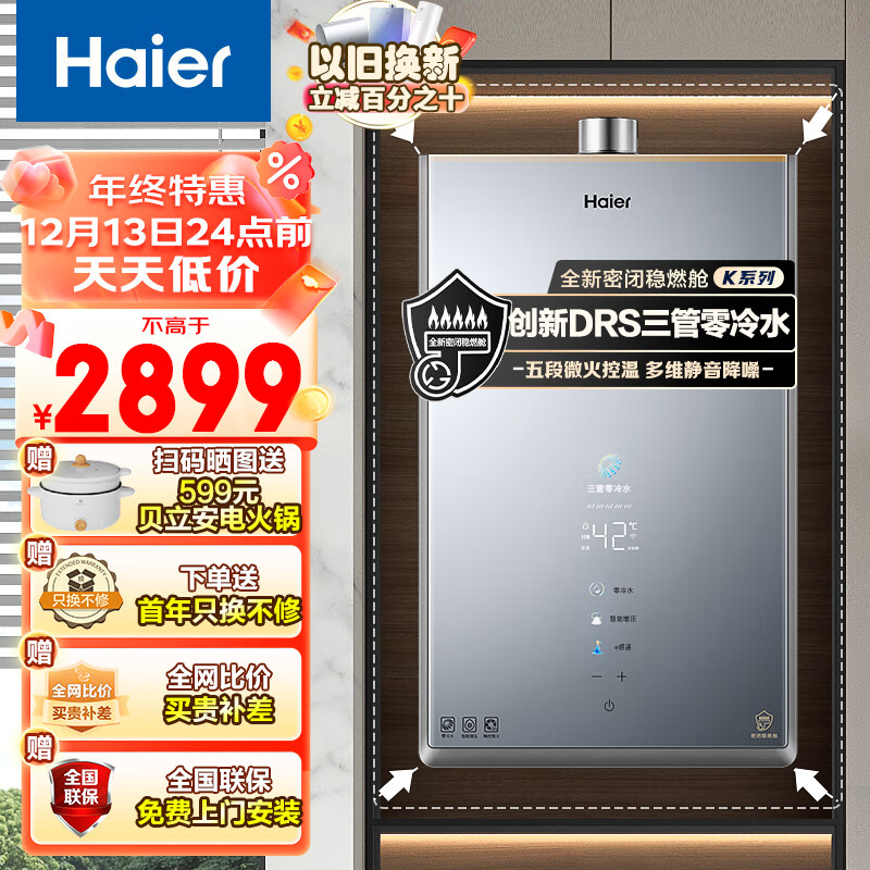 海尔(Haier)16升燃气热水器天然气 DRS三管零冷水 全新密闭稳燃舱 五段微火控温 一级静音JSQ31-16KT3FRXGU1价格:3199.00元!