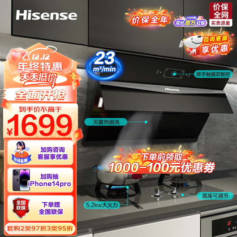 海信(Hisense)抽油烟机侧吸式烟机燃气灶5.2kW套装 家用大吸力烟灶套装低噪瞬吸DJ918H+DB31 以旧换新价格:1799.00元!
