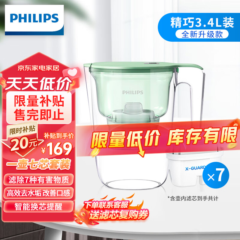 飞利浦(PHILIPS)全新升级净水壶 家用滤水壶 厨房自来水过滤净水器 AWP2813GNT 一壶7芯价格:169.00元!