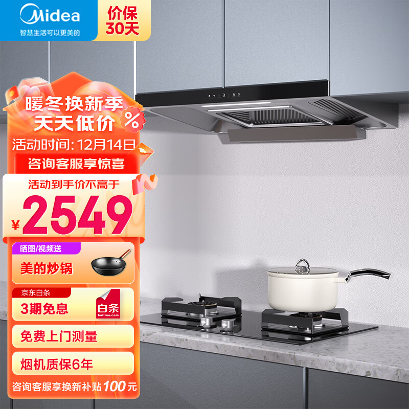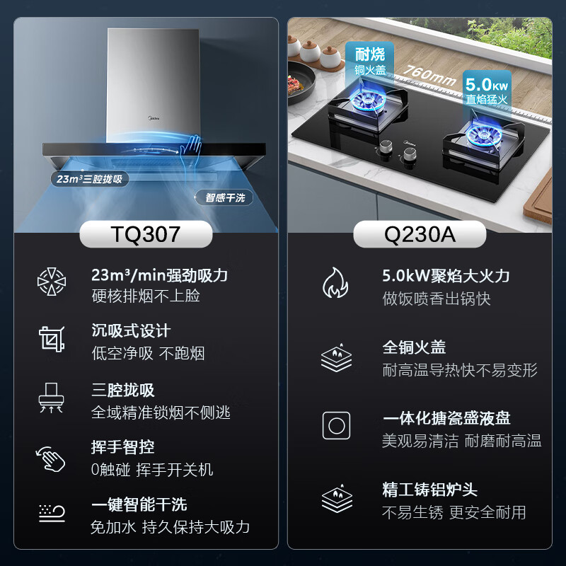 美的抽油烟机灶具套装23大吸力自动清洗吸烟机燃气灶套装TQ307+Q230A天然气价格:2549.00元!