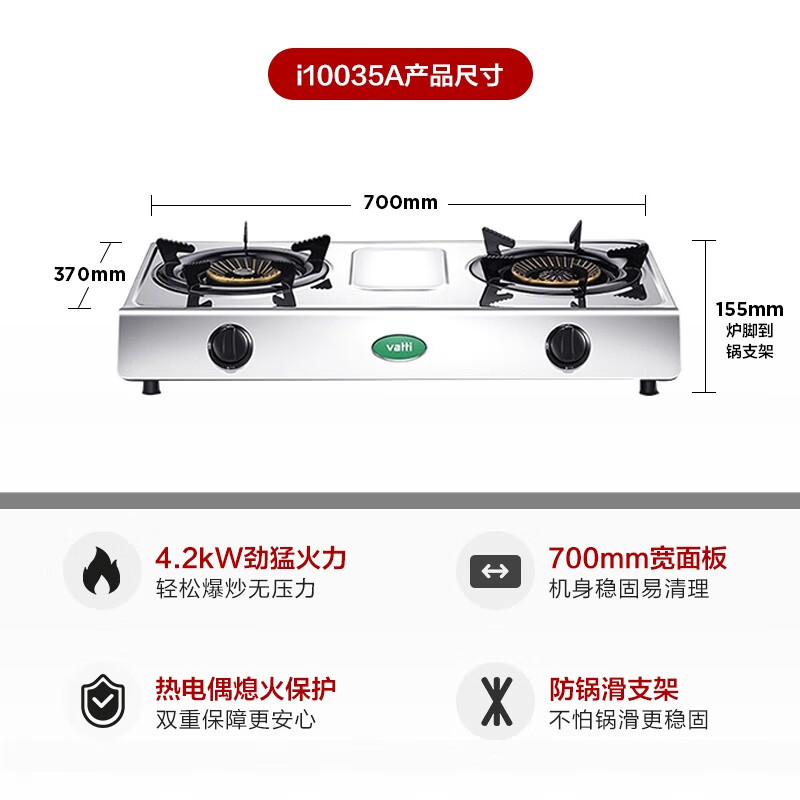 华帝(VATTI)燃气灶 家用台式 4.2kW易打理熄火保护 不锈钢面板双灶台灶具 JZY-i10035A(液化气)价格:499.00元!