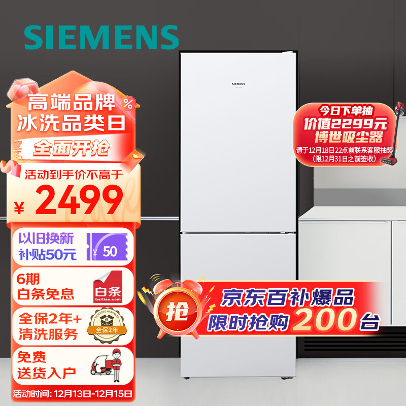 西门子(SIEMENS) 279升 风冷双门冰箱 全无霜 多维出风 电脑控温 LED内显(白色)KG29NV220C价格:2499.00元!