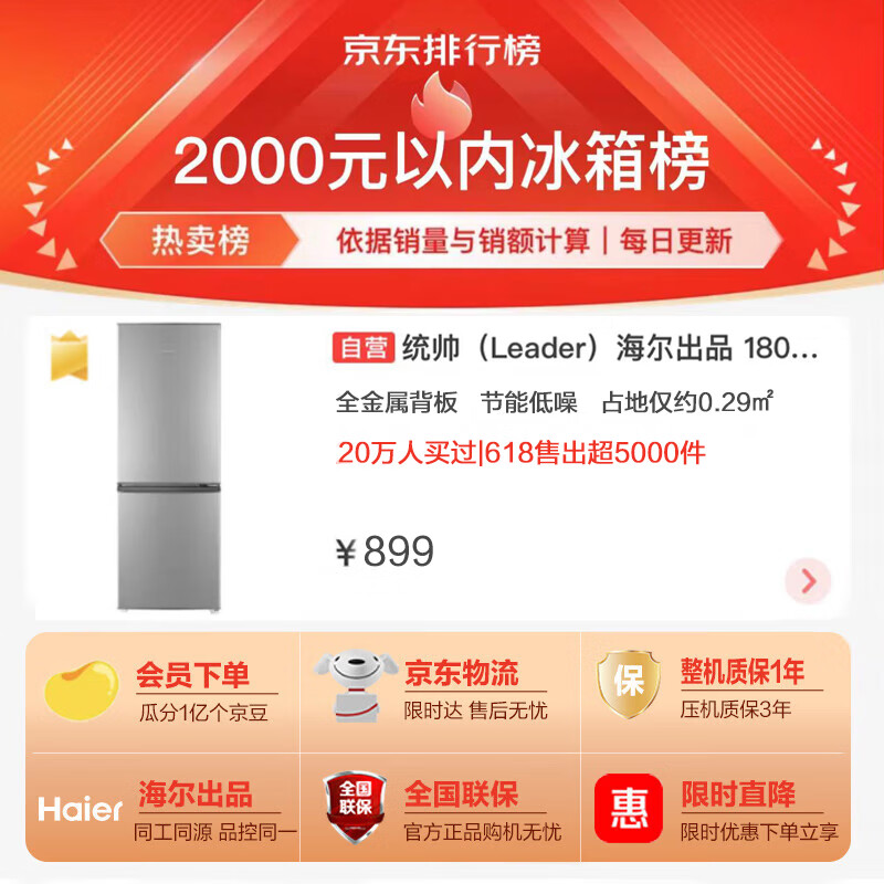 Leader 海尔智家出品180升两门二门双门小冰箱家用小型租房省电低噪音不占地方电冰箱BCD-180LLC2E0C9价格:899.00元!
